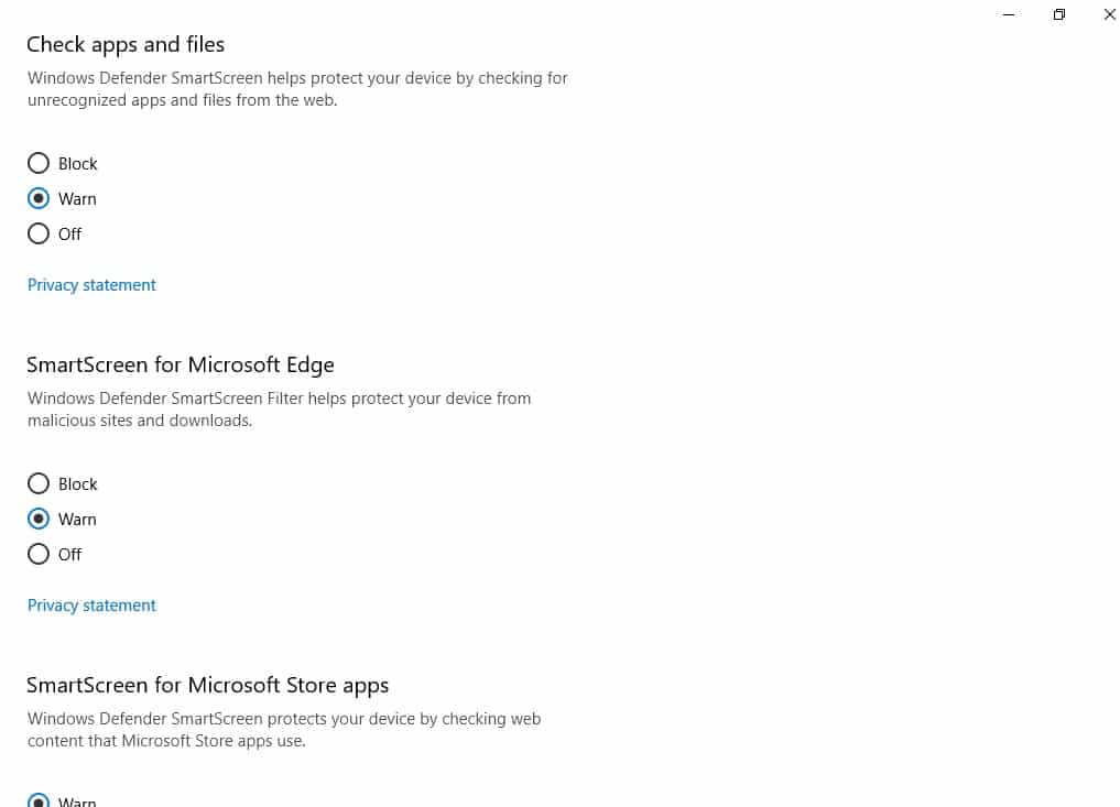 - Check apps and files, SmartScreen for Microsoft Edge, and SmartScreen for Microsoft Store apps is set to Warn or Block