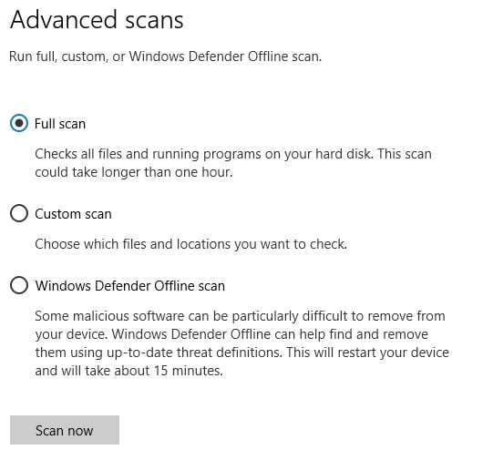 Now a full, custom, or Windows Defender Offline scan can be run: