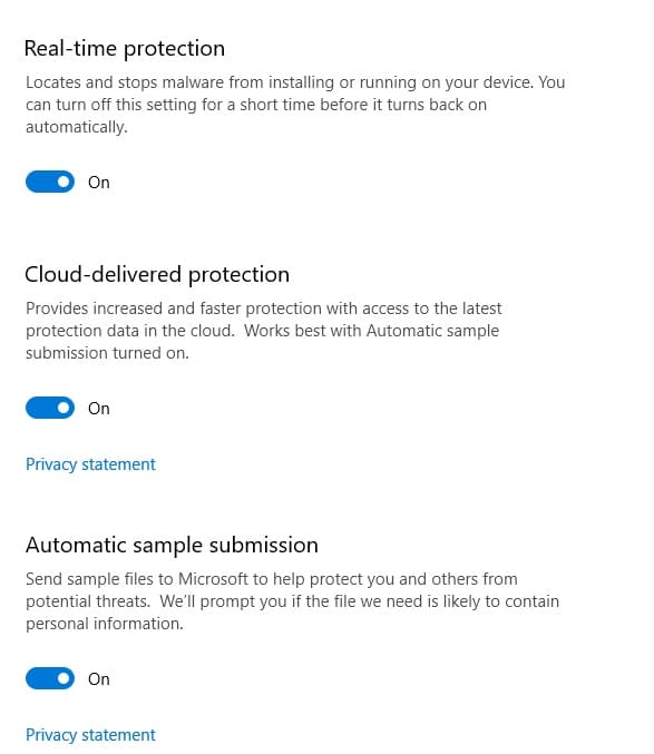 - If your protection settings are Off, turn On Real-time protection, Cloud-delivered protection, and Automatic sample submission