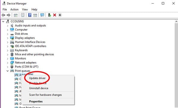 Update the driver in the Device Manager settings. Navigate to Print Queues, find your Canon printer, and right-click Update Driver. Then follow the instructions on the screen to search for the appropriate update, which the computer will install for you.