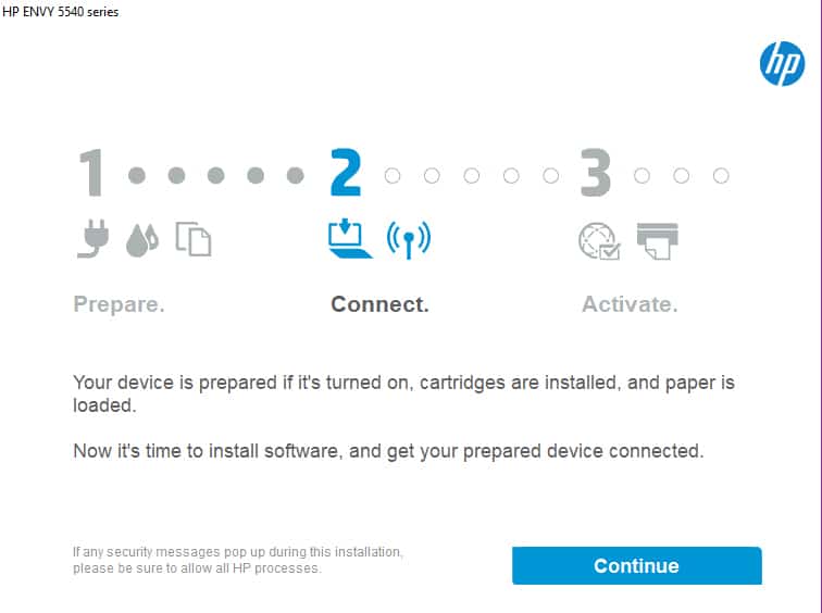 After your printer is turned on, has ink cartridges, and is loaded with paper, you’ll be ready to hit the Continue button. From there, the driver will walk you through the final steps of the installation.