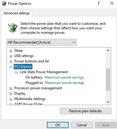 - Click on the PCI Express drop down and change the Maximum power savings to off.