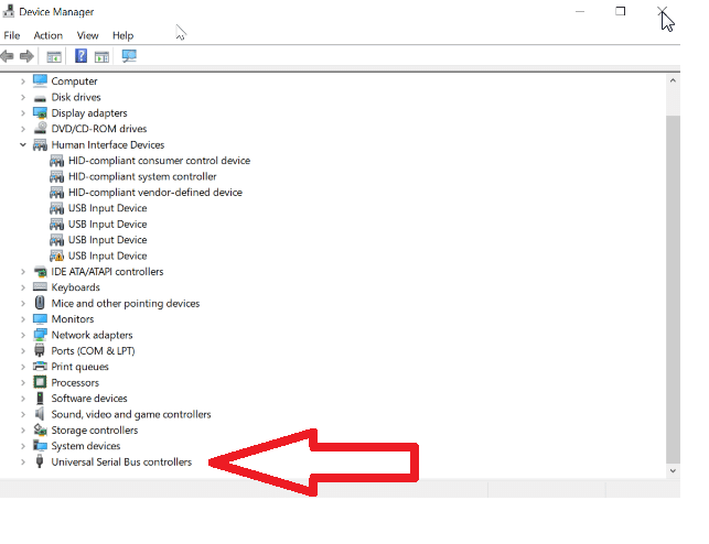 When Device Manager starts, look for the Universal Serial Bus Controller, and click the arrow to expand the list: