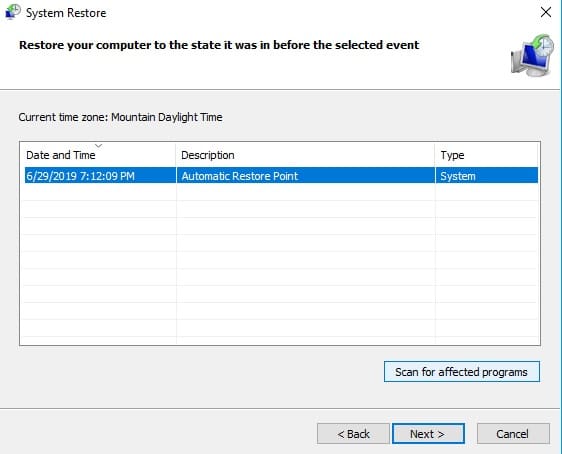 - Select a System Restore point and then Scan for affected programs. You can see the list of changes, select Next and